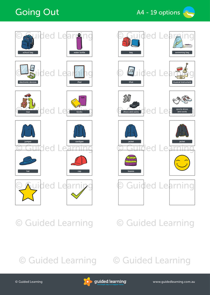 - Contains a Going Out Routine Chart (laminated) that displays an 8 card sequence with a magnet attached to the back